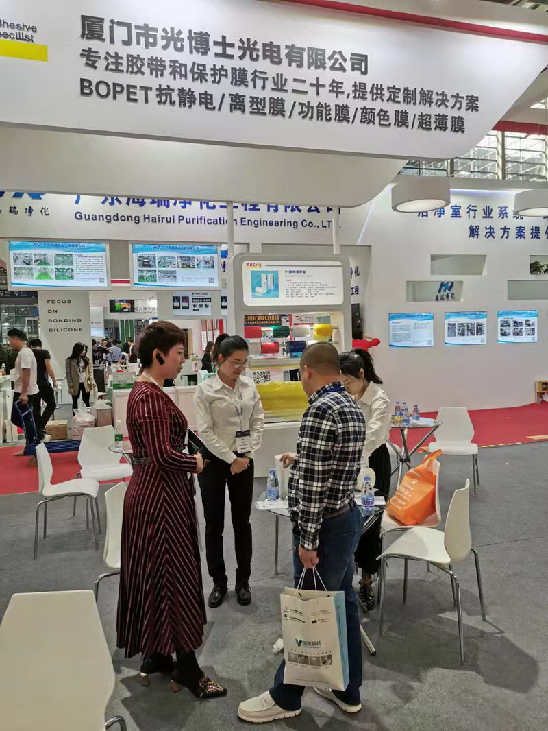 廈門市光博士光電有限公司參加的 2019年11月21-23日在深圳國際薄膜與膠帶展覽會,BOPET抗靜電保護膜,離型膜,功能膜,顏色膜,超薄膜,CPP保護膜,PE保護膜等樣品,吸引了大量觀眾駐足觀看。并在展會現場接待的1000多個中外客商。在現場火爆的人氣和高質量的互動活動中公司產品獲得廣泛的認可。在展會上對國外客商提供的英語,德語,西語業務咨詢服務。